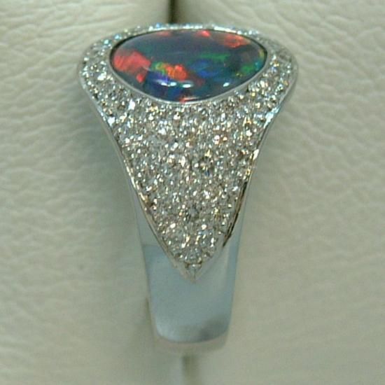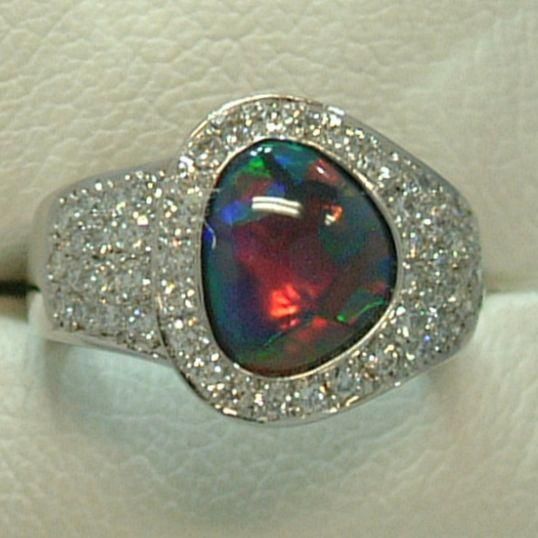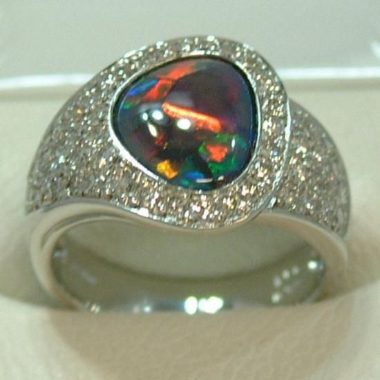 Black opal プラチナブラックオパールリング。角度で様々な色を楽しめる遊色赤ふのきれいな素晴らしいブラックオパール、これを逃すと二度と手に入らない手造りの逸品です。
